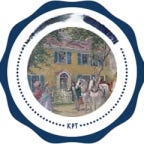 Photo of The Judge, sitting in the living room of our house, set against a mural of the house painted in 1925, to depict the home in the 1800’s, when it was a stop along the stage coach line to Portland. The Judge had the mural painted by Louis Norton—who you’ll meet later.